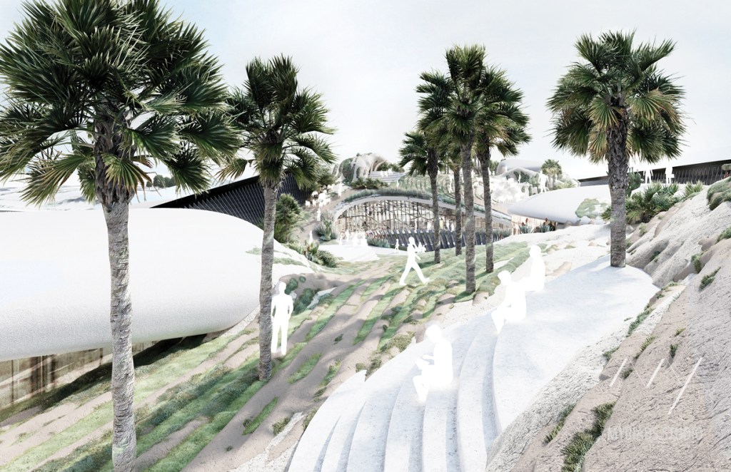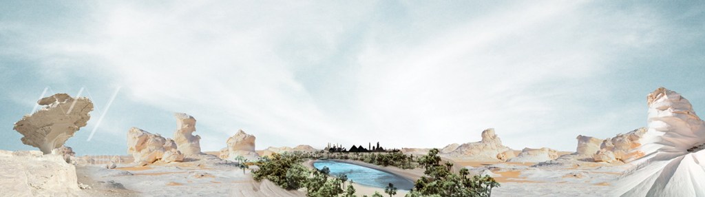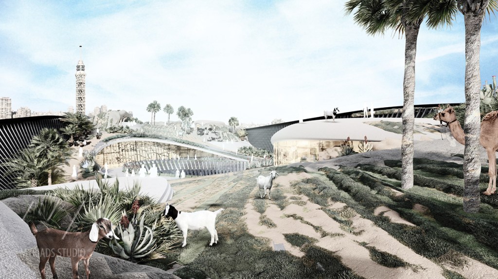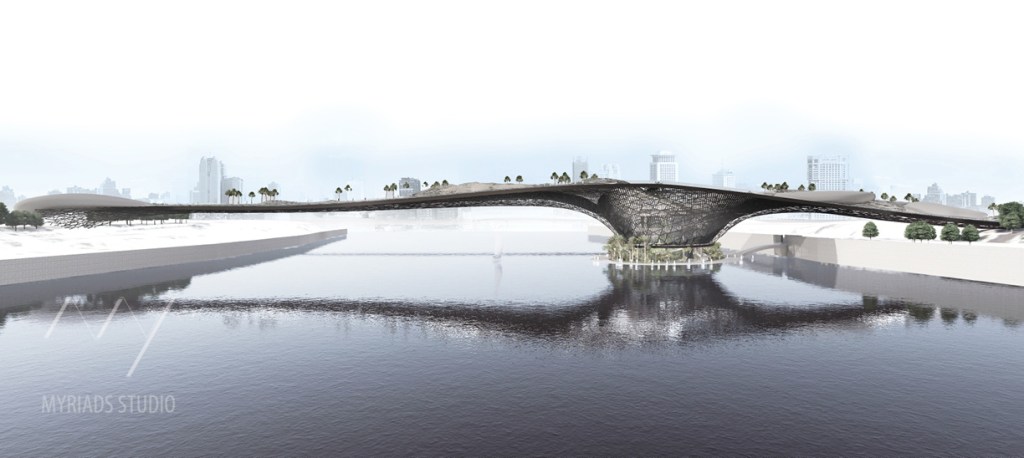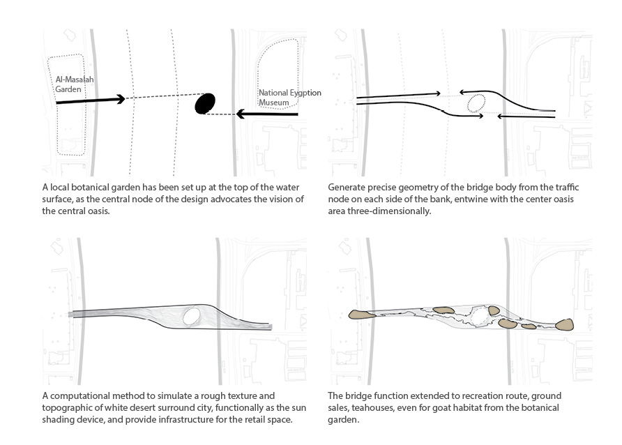 This bridge will be built like an emerald necklace laying on the Nile, become the horizontal landmark of Cairo, and blur itself into the local lifestyle. A local botanical garden has been set up at the top of the water surface, as the central node of the design advocates the vision of the central oasis. Base on that, we generate precise geometry of the bridge body from the traffic node on each side of the bank, entwine with the center oasis area three-dimensionally. For the top surface of the bridge body, we use a computational method to simulate a rough texture and topographic of white desert surround city, functionally as the sun shading device, and provide infrastructure for the retail space. The bridge function extended to recreation route, ground sales, teahouses, even for goat habitat from the botanical garden. The composition of construction articulates an irregular surface and smooth panel together, fantastically, an evolution from the natural landscape to the cultural landscape.