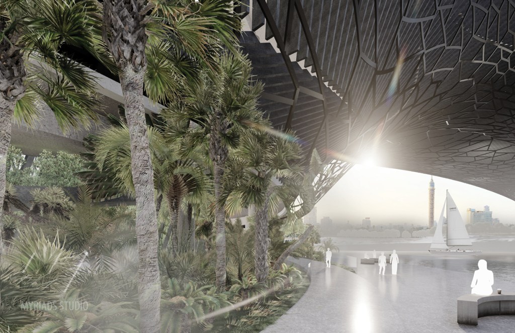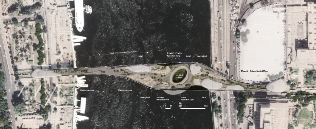 Building a pedestrian bridge on the Nile river at the center city of Cairo is an opportunity for acculturation interpretation under the urban space organization’s sequences. Neither the Pyramid nor Minaret could articulate a complex culture symbol of Cairo. Instead, we are exploring a way to return to the original nature of Egypt. Rather than dig into the black hole, catalog and describe the complicated culture itself, we propose to use the ordinary nature landscape of Egypt as the media to coordinate this cultural problem. We claim that this layer of the coordination could construct the linkage between each fragment of this particular culture and the collective consciousness of citizens. It will allow visitors and residences to perceive the interaction between the natural landscape and cultural landscape in the center of the city; it creates the condition to generate the symbolic cultural representation.