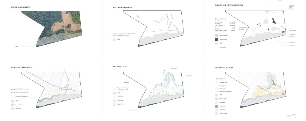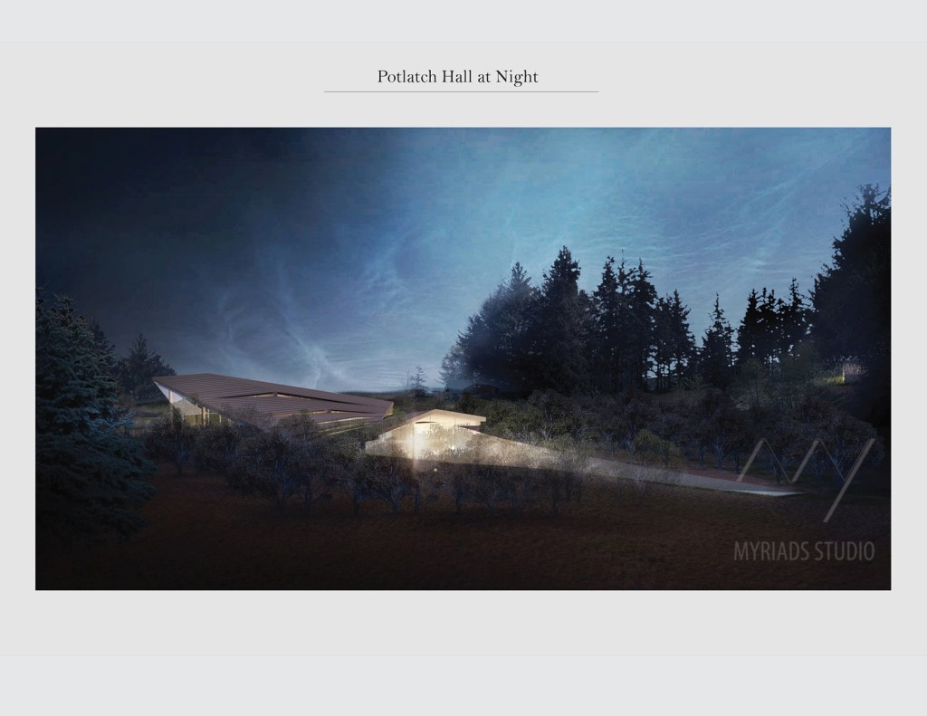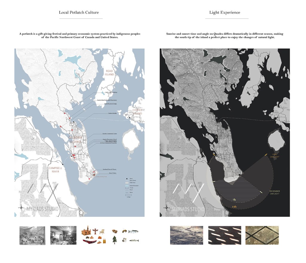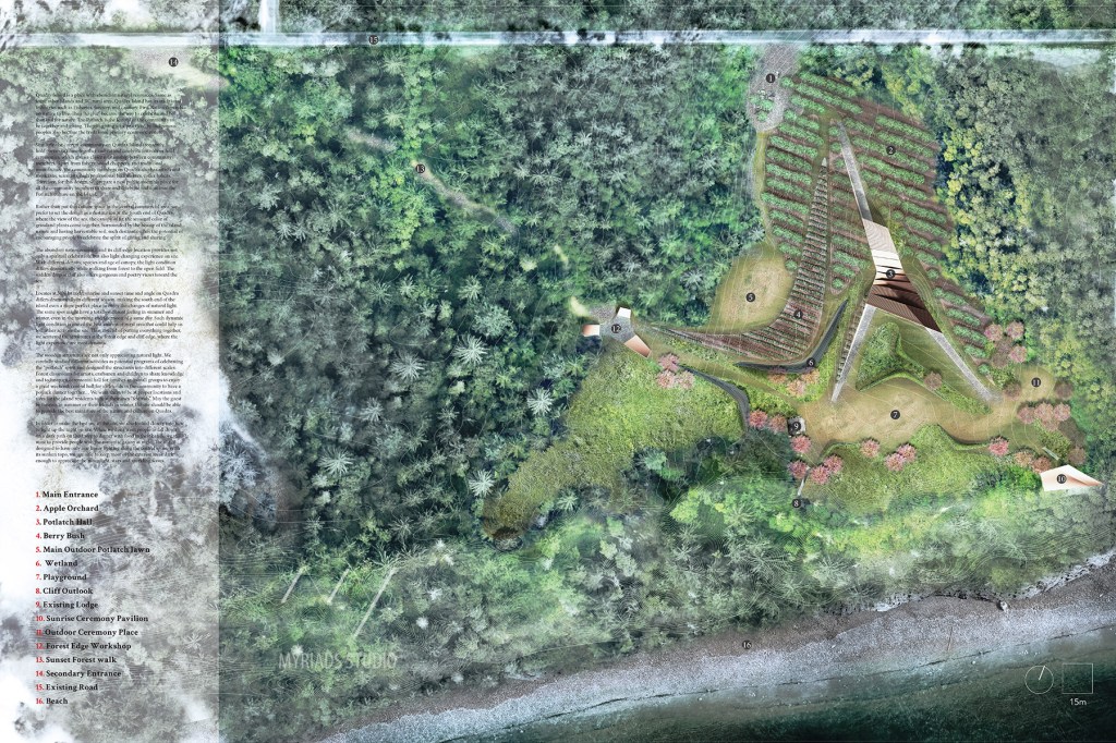 Therefore, for this design, we prepare a new public assembly place for all the community members to share and celebrate and continue the Potlatch culture on the Island. Rather than put this culture space in the central commercial area, we prefer to set the design as a destination at the South end of Quadra, where the view of the sea, the canopy of fir, the seasonal color of grassland plants come together. Surrounded by the beauty of the island nature and having harvestable soil, such destination has the potential of encouraging people to celebrate the spirit of giving and sharing.