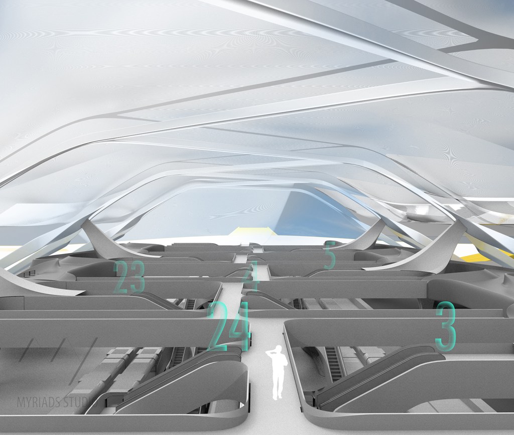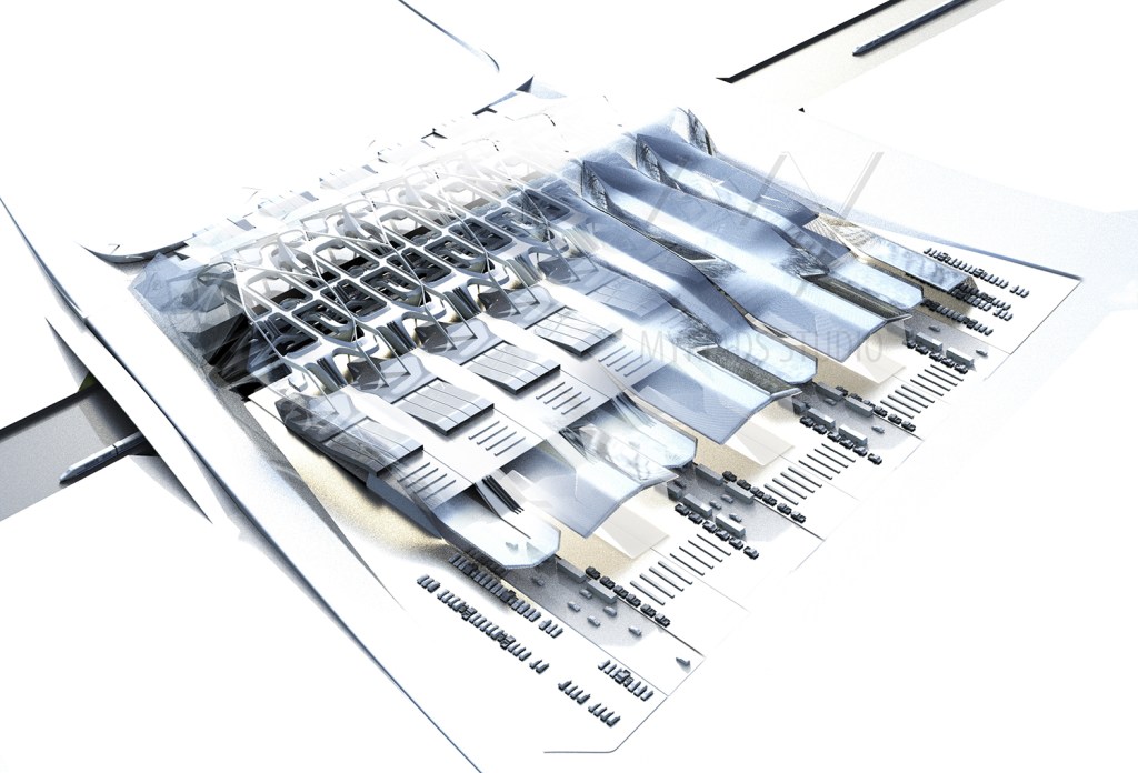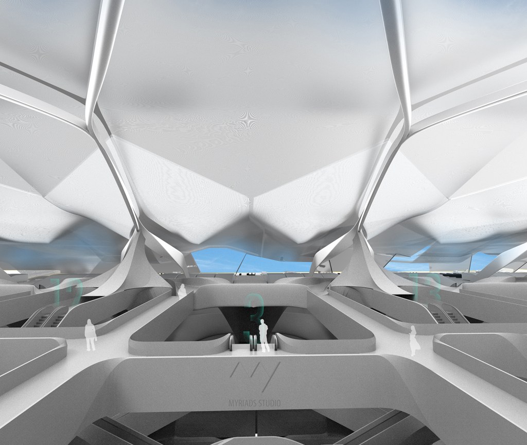 在设计中,我们将可能性的剧本架设在这种精确运转的人居环境的假说中: 列车可以轻易的精确停靠在月台的任何位置,传输系统将嵌套于结构之中,并将乘客物品运送到指定的地点。值乘系统将与虚拟现实与云技术结合,将复杂的车站人流分散并在最短距离里抵达列出。