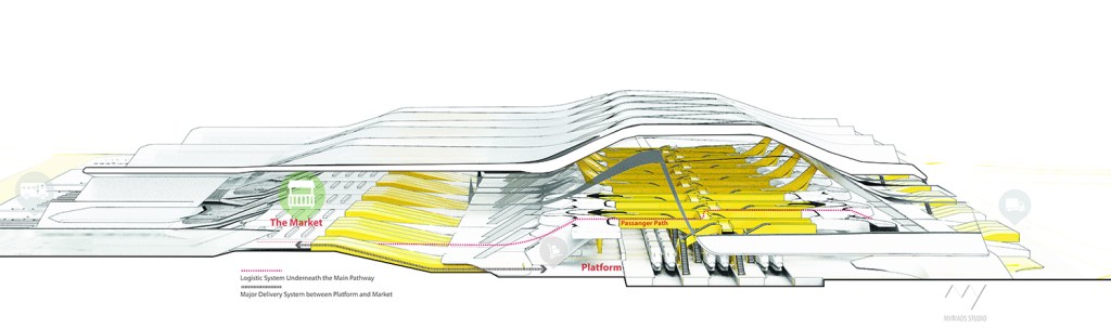 We call our proposal ‘Terminal PARK’ because it suggests a near-future transportation hub capable of parking the object’s different speed, connecting them through designed space, and the intersection of different speeds. ‘Terminal PARK’ also provides service and allows local activity to integrate with advanced technology. The audiences of space will vary from farmer to traveler, fit local as part of ‘PARK’ also bring recognition to the public. Only the Market place appears at commuter circulation, but those goods are running parallel with people hiding in the escalator, pathway, and structure. The proposal has been a break down into a matrix. It is enhancing the relationship between the object to another object in a shorter distance and smaller scale. The market becomes the interface between retail, transportation, and the logistic system behind.